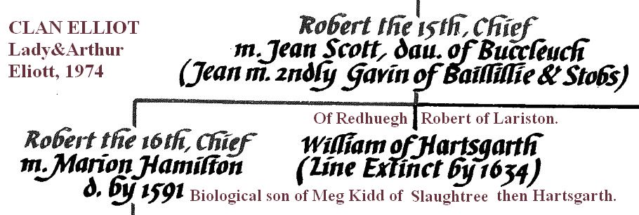 Gavin Elliot married Jean Scott sister to Buccleuch 1607 who had daughter probably name Jean who married Thomas Rutherford of Edgerston, and had a daughter named Jean which married William Elliot of Lariston son of Robert of Redheugh, living in Lariston nearer to a Maggie Kidd of Slaughtree (willow tree).