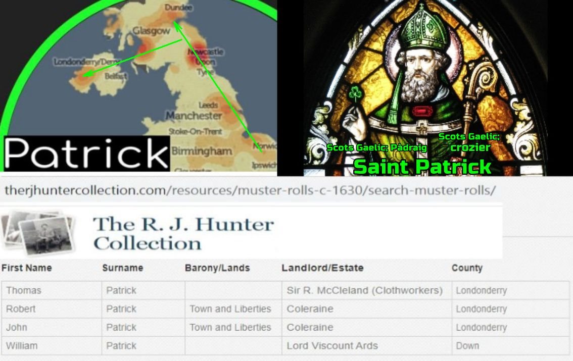 http://www.therjhuntercollection.com/resources/muster-rolls-c-1630/search-muster-rolls/ https://named.publicprofiler.org/ Kirk (Scottish)/Kil(Gaelic influenced) Patrick. ‘The church of Saint Patrick’. http://clancrozier.com/