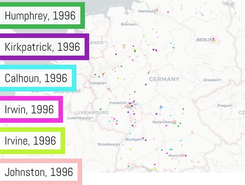 Migration into West Germany of Border names before 1996. https://nvk.genealogy.net/map/1996:Humphrey,1996:Kirkpatrick,1996:Calhoun,1996:Irwin,1996:Irvine,1996:Johnston