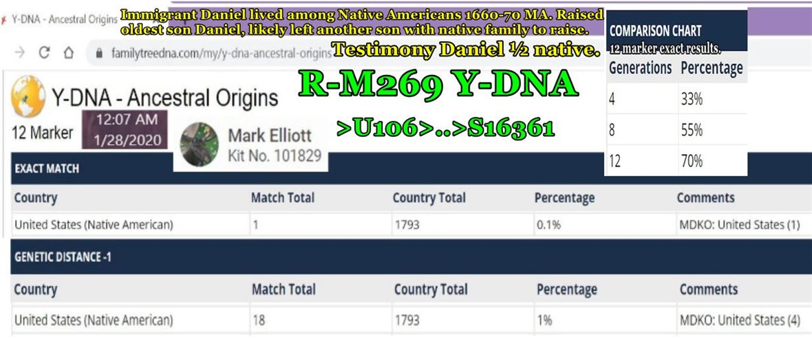 For me to have an exact match at twelve markers with a Native American, would mean immigrant Daniel Elliot, would have a Native American wife, which he chose to raise the oldest named after him from. The wife would also have a son of Daniel’s. This would go beyond an autosomal match of about eight or nine generations, and would be at approximately twelve generations. If raised many generations by people Native to America after awhile they would look pretty pure bread, and be taken to be Native from America. This is likely the reason I have not been able to locate immigrants Daniel’s wife. Likely for the arranged family of his half native son, to a daughter of the son of seaman John Cloyse, his son Peter, which brought family to America. Otter Neck to build home and mill as an indenture. https://www.wikitree.com/photo.php/5/5a/Elliot-1211-1.jpg https://gorrenberry.com/wp-content/uploads/2015/01/Stone-Grants-in-Sudbury-History-1.jpg https://gorrenberry.com/wp-content/uploads/2015/04/Otter-Neck-attended-Sudbury-Church.jpg https://elwald.com/wp-content/uploads/2018/03/Alexander-Gordon-John-and-Daniel-Stone-Thomas-Kemble-and-Daniel-Elliot.jpg