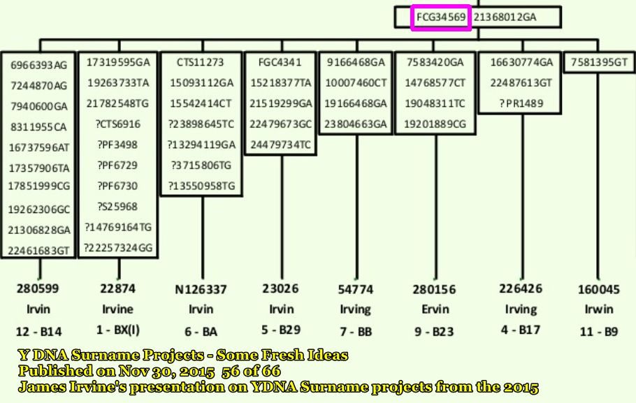 Y-DNA Surname Projects – Some Fresh Ideas Published on Nov 30, 2015 56 of 66 James Irvine’s presentation on YDNA Surname projects from the 2015 https://www.slideshare.net/FamilyTreeDNA/y-dna-surname-projects-some-fresh-ideas Typo; FCG to FGC34569