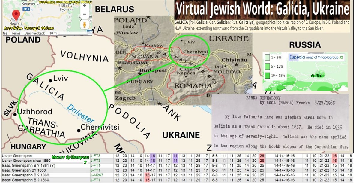 https://d3tije9h5o4l4c.cloudfront.net/social-photos/3606085?dpr=2&fit=max&h=305&w=590 Galicia, Ukraine, Births, Marriages, and Deaths, 1789-1905 Text-only collection; Name: Isak Grünspan Event Type: Marriage Marriage Year: 1868 Marriage City: Husiatyn Name: Uszer Grünspan Event Type: Death Death Year: 1892 Death City: Czortkow http://www.encyclopediaofukraine.com/pic%5CJ%5CE%5CJews_Map.jpg South to southeast of; Ternopil (Тернопіль) Ternopil Oblast, Ukraine. That FTDNA Y-DNA data is a great tool for the family history genealogist. Mom’s maiden name is Barna, and other than mom she went by Alma Barna Elliott. Stephen Barna is the father of mom’s dad Stephen Peter Barna. My name Mark Stephen Elliott, comes from both my grand parents, dad’s dad containing the Y-DNA, Mark (no middle name) Elliott. Was given a middle name from a family name line on his birth certificate but rejected it. Stephen Peter Barna, mom’s father does not have Y-DNA or mtDNA but shows of it in autosomal DNA, but his wife Josephine Ryan carries the mtDNA, and is of southern Ireland.